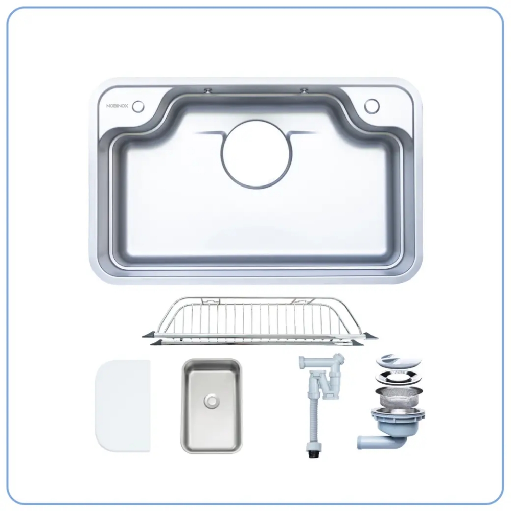 Chậu rửa chén NOBINOX ARVO B180 chống xước 1 hộc còn đi kèm bộ phụ kiện gồm thớt nhựa, rổ và khay linh kiện giúp mở rộng công năng sử dụng ngay trên khu vực bồn rửa. Thớt nhựa cho phép người dùng sơ chế thực phẩm trực tiếp trên chậu, trong khi khay inox có thể dùng để ngâm rửa rau củ. Rổ inox hỗ trợ úp chén bát hoặc thực phẩm sau khi rửa giúp nước thoát nhanh và giữ khu vực bếp luôn gọn gàng. Bộ phụ kiện này giúp tối ưu quy trình chuẩn bị thực phẩm, góp phần nâng cao hiệu quả sử dụng không gian bếp.
