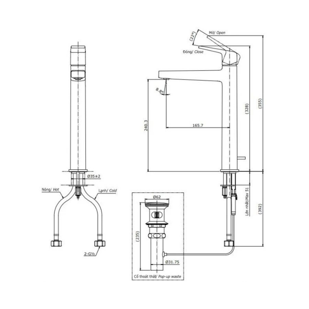 • Áp lực nước: 0.05MPa ~ 0.75MPa