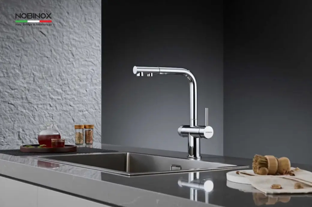 Vòi rửa chén dây rút 3 đường nước NOBINOX MIRA NX333 là giải pháp tối ưu cho các gian bếp hiện đại có sử dụng máy lọc nước RO. Sản phẩm được thiết kế với hai đầu vòi riêng biệt, cho phép sử dụng đồng thời nước sinh hoạt nóng lạnh và nước lọc trong cùng một hệ thống. Với thân vòi làm từ đồng cao cấp, hoàn thiện bề mặt Chrome sáng bóng cùng chiều cao 330mm, MIRA NX333 mang lại không gian thao tác thoải mái và đảm bảo độ bền ổn định trong quá trình sử dụng.